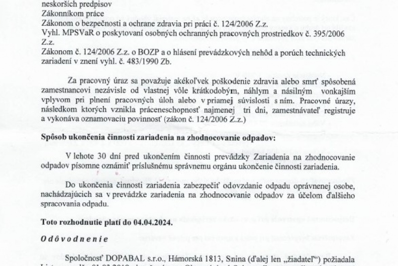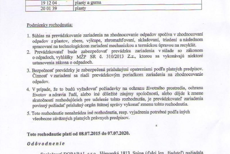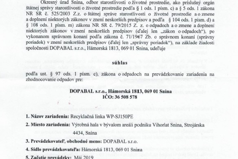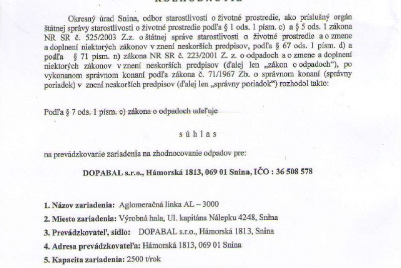 In 2007, DOPABAL s.r.o. was granted approval for the operation of a waste recovery facility applying the R3 method, which was renewed and extended according to the waste management legislation.