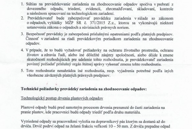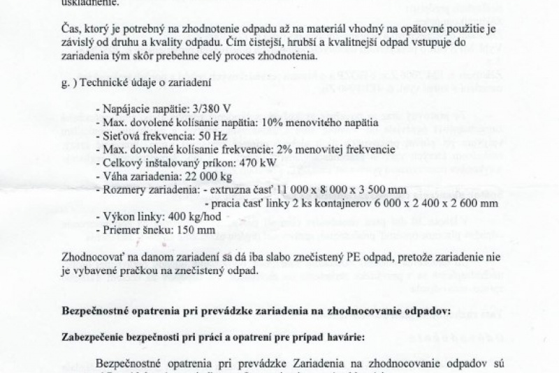 In 2019, DOPABAL s.r.o. was granted approval for the operation of a facility designed for the recovery of plastic waste contaminated with hazardous substances, i.e. hazardous waste, by applying the R3 method. The capacity of the hazardous waste recovery facility is currently 3500 tonnes/year, which statistically represents the total annual production of this waste in the SR.