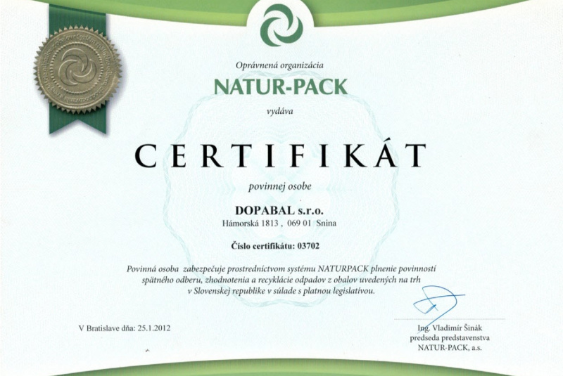 DOPABAL s.r.o. fulfils all the legislative requirements in the field of packaging, it is registered in the list of packaging manufacturers of the Ministry of the Environment of the Slovak Republic under Number PO_0009018, and is a member of the Producer Responsibility Organisation NATUR-PACK, a.s.