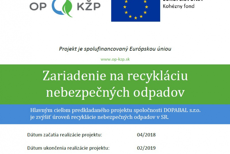 In 2019, DOPABAL s.r.o. implemented the ‘Hazardous Waste Recycling Facility’ project, which was co-financed by the European Structural and Investment Fund under the Environmental Quality Operational Programme.
