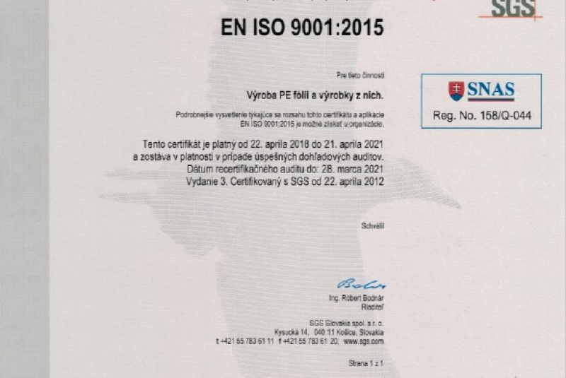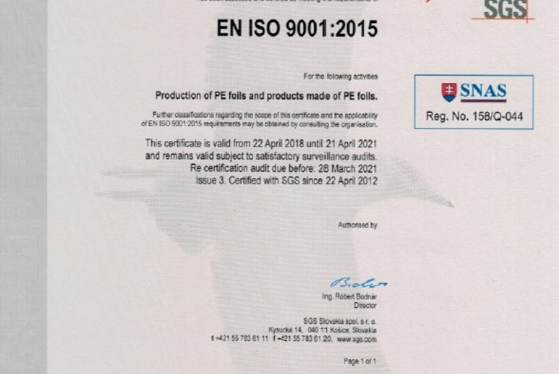 The main activity of the company is the production of clean and printed three-layer coextruded film and single-layer extruded film made from LDPE, LLDPE and MDPE (tube, semi-tube, film, full-area perforation, partial perforation, printing of recycling signs and gusseted film) and of other film products.